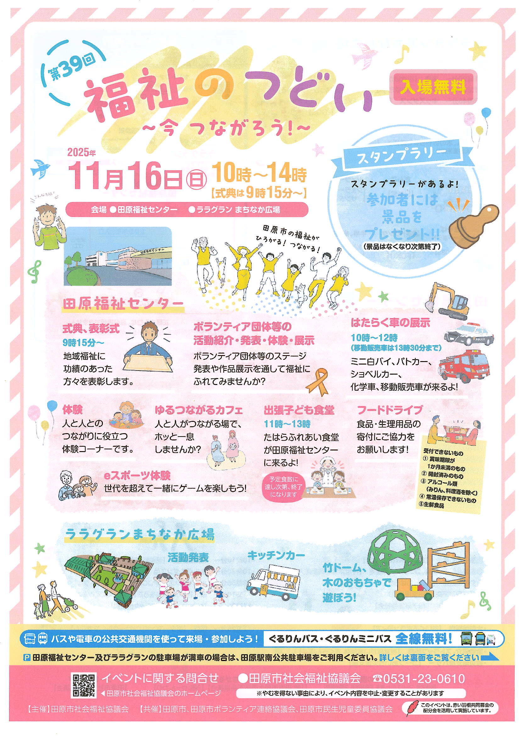 田原市社会福祉協議会が主催する「第39回福祉のつどい」のチラシです。令和7年11月16日(日)に田原福祉センター、ララグランまちなか広場にて開催されます。 |