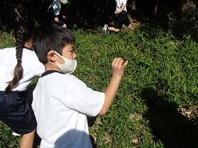 1年生の教室が楽しそうです。落ち葉や木の実を拾ってきてアートの世界に浸っています。いろいろな葉や木の実を組み合わせての作品づくりです。