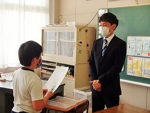 今日は朝の時間に校長先生が1年生の教室で