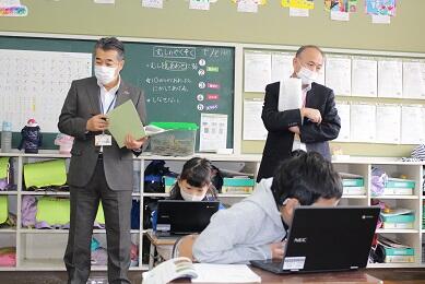 運営委員と表彰の子は食堂でタブレットを見ています。