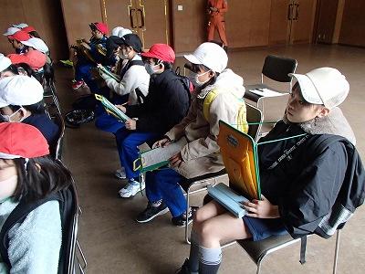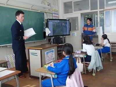 3年生は、消防署員と消防団員に来ていただき、防災学習と消防団の詰め所にも出かけました。